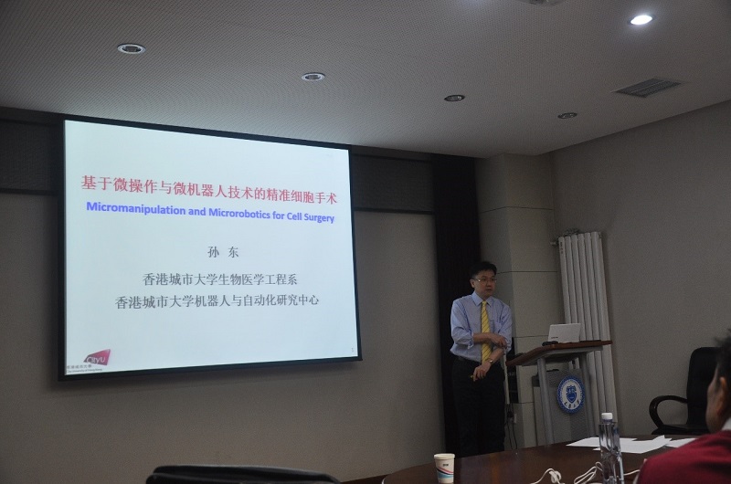 孙东教授介绍其团队利用机器人技术与微型工程工具实现的各种特殊终端,包括光学镊子、微针和电磁设备,并特别介绍了其团队磁性驱动细胞靶向递送研究成果。