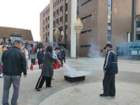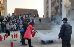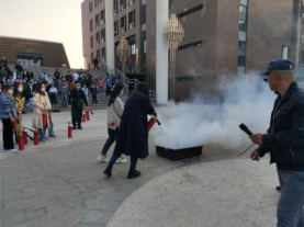保卫处防火科科长弓保津老师为全体师生讲解消防安全、注意事项及灭火器的使用方法,在其指导下,大家积极参与,师生齐上阵,依次拿起灭火器,进行灭火演练。