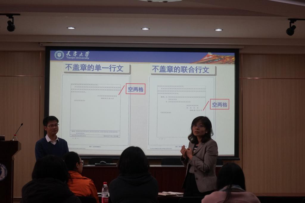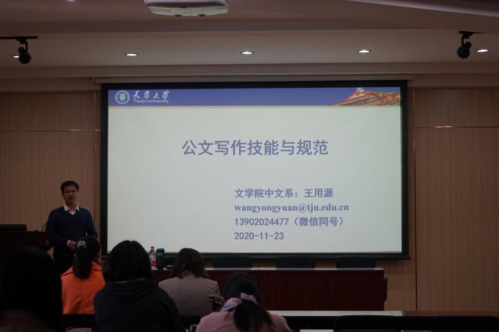 本次培训特别邀请了天津大学外国语言与文学学院中文系副主任,天津市语言学学会常务理事王用源老师。王老师从计划类文书写作、总结类文书写作、常用公文写作与用章规范三方面进行讲解,以具体案例为模板现场进行分析点评,形象生动地展示了公文写作的技巧与规范。