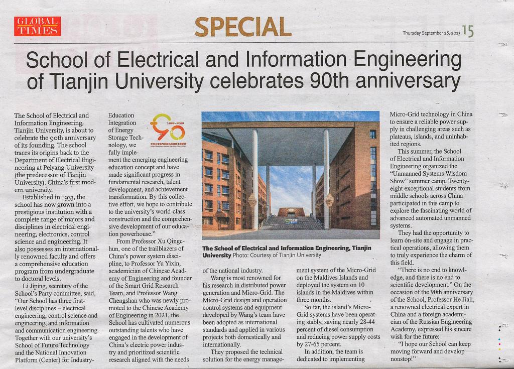 The School of Electrical and Information Engineering, Tianjin University, is about to celebrate the 90th anniversary of its founding. The school traces its origins back to the Department of Electrical Engineering at Peiyang University (the predecessor of Tianjin University), China's first modern university. Established in 1933, the school has now grown into a prestigious institution with a complete range of majors and disciplines in electrical engineering, electronics, control science and engineering. It also possesses an internationally renowned faculty and offers a comprehensive education program from undergraduate to doctoral levels.