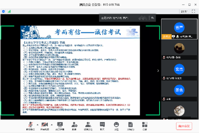 自动化学院一直将“立德树人”作为学生培养的根本目标,致力于将学生培养成具有“天大品格”的新时代优秀青年。在考试周到来之际,各年级深入开展“感恩于心,诚信于行,励志于己”线上主题班会,各班学习了关于电信诈骗、校园贷、个人征信、诚信考试、感恩奉献几个方面知识。