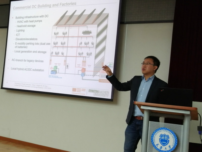随后,7位中方企业专家作了精彩的大会报告。江苏电科院刘瑞煌博士分享了江苏对《中低压直流配用电技术的探索与思考》,中国电科院张海博士就直流配用电标准及北京直流实验室做了《直流配电工作介绍》的主题报告,浙江电科院李鹏博士介绍了《海宁主动配电网工程》,天津电科院马世乾博士对《天津北辰大张庄智慧能源小镇中压配电柔直站示范工程》做了详细讲解,南京国臣电力公司严建海先生汇报了《楼宇直流系统实践进展》的实践进展,汉能控股集团张航先生做了题为《汉能公司新能源接入及直流配网研究现状》的主题报告。最后,天津大学朱琳博士介绍了天津大学直流配用电控制、保护以及智能建筑方向的青年科研团队及所取得的科研成果。