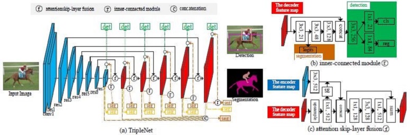 二、物体检测算法不能识别路面、海面、草地、便道、天空等不能用包围框表达的可行驶区域和背景。解决该问题的一个直接方法是单独构建一个用于图像语义分割的深度卷积神经网络。然而,该方法势必使系统的效率成倍下降。为了解决该问题,国家博士后创新人才支持计划获得者曹家乐及其导师庞彦伟教授等提出了一套新的检测-分割互增强机制,构建了新的网络架构:TripleNet。由于TripleNet仅在训练时在若干层上同时施加检测、多类分割、前-背景分割约束,而在测试阶段并不需在这些层上进行多任务处理,所以在同时显著提高检测精度和分割精度的情况下几乎没有增加计算代价。