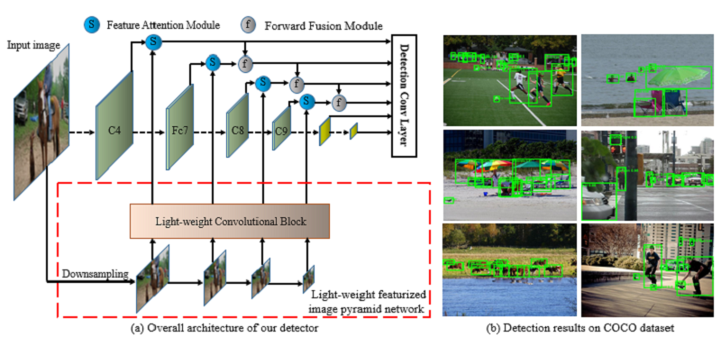 一、深度神经网络对输入图像进行深层非线性特征提取。由于该深层特征(可称为深特征)强大的抽象表达能力,使物体检测性能相比传统基于手工设计统计特征方法有质的提高。那么,底层特征或浅特征是否还有价值,如何充分利用浅特征?为了回答该问题,庞彦伟教授和硕士生汪天才等提出了一个全新的轻量级特征化图像金字塔网络,该网络可以高效地提取浅特征。同时提出了一种特征注意力模型用浅特征对深特征进行有效增强。在超过已知同期最高检测精度前提下,将物体检测速度提高到每秒111帧。