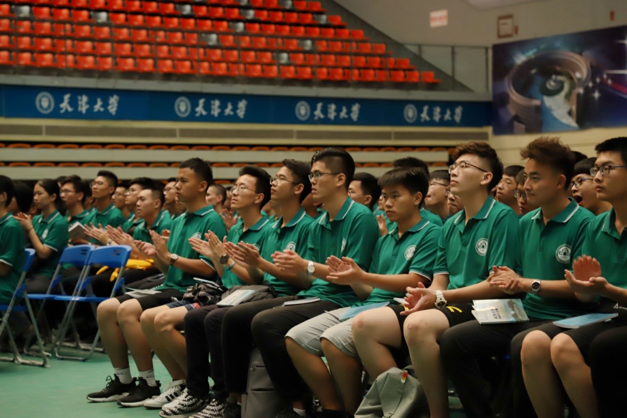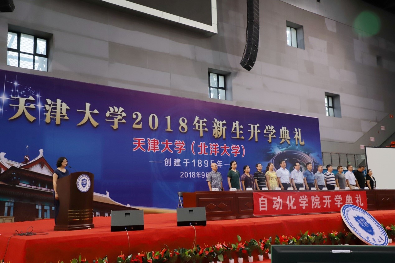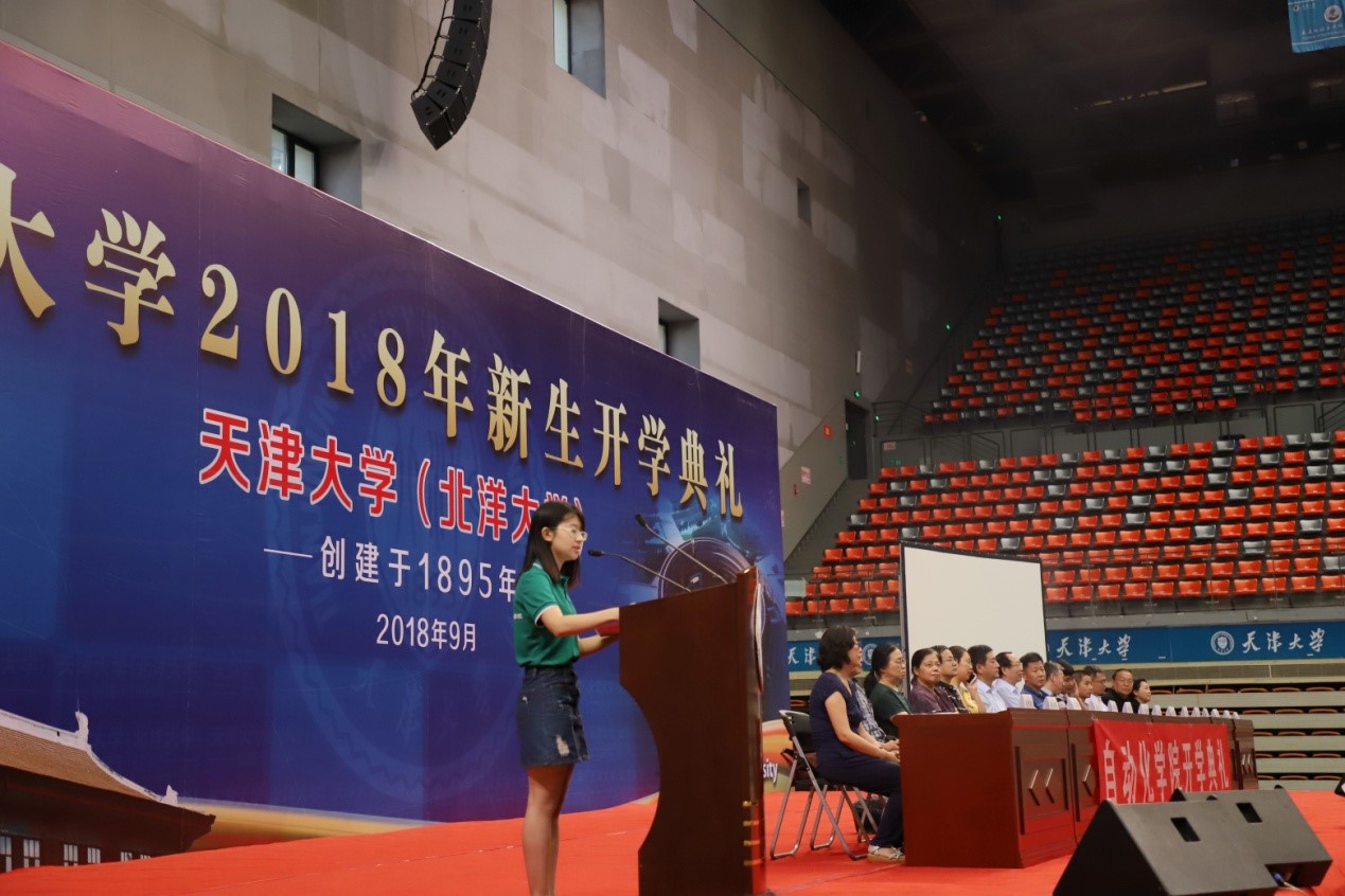 典礼伊始,全体师生奏唱国歌。2018级自动化专业唐卓作为本科生新生代表上台发言。她讲述了自己与天津大学相识、相知的故事。对天大的认识,最初始于校花“海小棠”、网红食堂、最美图书馆、天津大学星等具体的天大标志性事物,而当了解了“实事求是”的校训、“严谨治学”的校风以及张太雷、马寅初等几代优秀校友的感人事迹,钦佩和向往之情便油然而生。最后她表达了对未来的展望与期盼,作为天大人,应该珍惜韶华,勇做开拓者、奉献者,将少年意气与赤子热情付诸于行动。