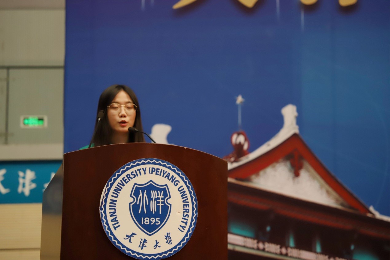 2018级电气工程专业的张一媚作为研究生新生代表发言。她在发言中提到,研究生对学习与科研能力提出了更高的要求,我们需要努力在专业领域做出自己的成果和贡献。但不能急于求成,板凳宁坐十年冷,文章不写半句空。并 表示天大人要立天大志向、展天大襟怀、承天大责任,在学有所成之时努力回馈母校,回馈学院。
