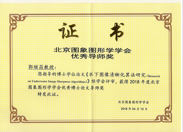 4月10日,北京图象图形学学会在北京航空航天大学新主楼会议中心公布了2018年京津冀地区优秀博士学位论文获奖名单,天津大学电气自动化与信息工程学院李重仪的博士学位论文《水下图像清晰化算法研究》荣获优秀博士论文奖,指导教师郭继昌教授荣获优秀指导教师奖。