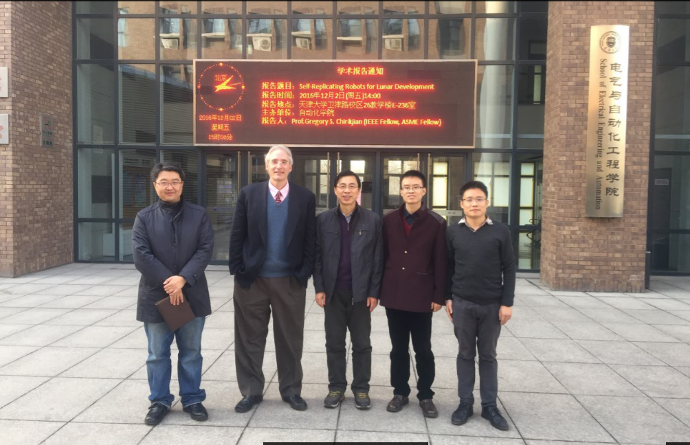 12月2日,应自动化学院邀请,约翰霍普金斯大学Gregory S. Chirikjian教授来天津大学进行交流访问,并在26楼E区236会议室做了题为“Self-Replicating Robots for Lunar Development”的学术报告,学院50余名师生听取了报告。在报告中,Chirikjian教授阐述了探月自复制机器人的总体系统结构,详细介绍了实验室开发的机器人样机的结构和原理,并就自复制机器人相关研究与应用与学院师生进行了深入交流与讨论。自动化学院副院长孟庆浩会见了Chirikjian教授,就未来在教学科研方面与约翰霍普金斯大学开展合作和交流等事宜进行了沟通。