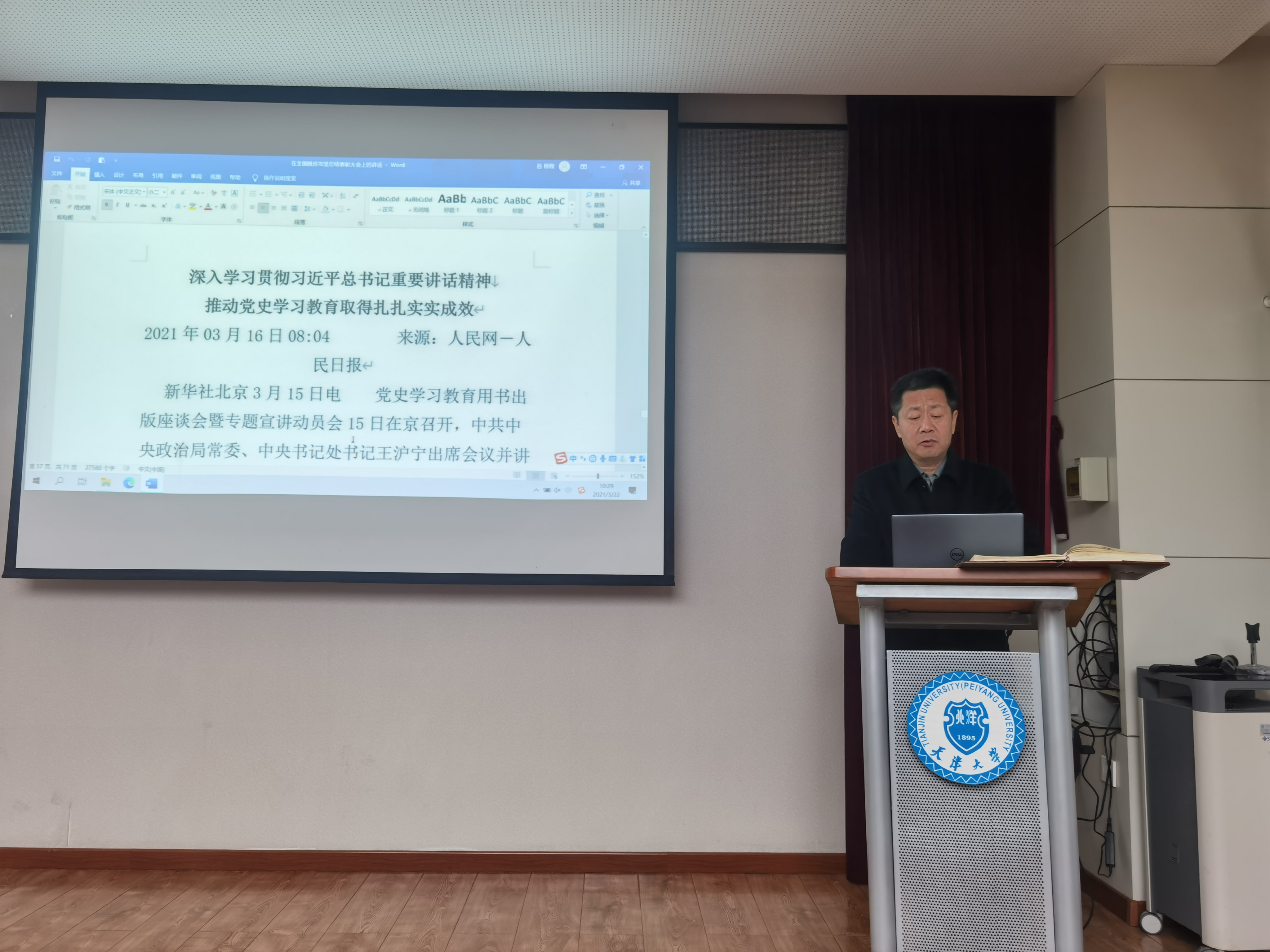 会上,结合天津大学关于开展党史学习教育的实施方案,李继平从总体要求、工作安排、组织领导三个方面进行详细介绍与解读,指出:要通过开展专题学习、加强政治引领、组织专题培训、实现学做结合、召开组织生活会和民主生活会等内容,扎实推进党史学习教育,突出学党史、悟思想、办实事、开新局,进一步引导广大党员师生增强“四个意识”,坚定“四个自信”,坚决做到“两个维护”,不断提高政治判断力、政治领悟力、政治执行力。