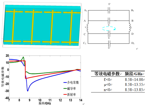左手材料是一种介电常数ε和磁导率μ同时为负的新型人工合成周期性结构。与传统材料不同的是:左手材料的电场 E、磁场 H 和波矢量 k 遵循左手定则,相速度和群速度方向相反。现阶段单面平行入射的左手材料结构是研究的主要方向。目前已经出现的多种单面结构,如十字金属线对结构、十字环形结构及双 S 型结构等。这些结构普遍存在着结构复杂、带宽窄、损耗大以及体积大等问题。结构简单、频带宽和损耗小的单面左手单元设计成为该领域的研究热点。